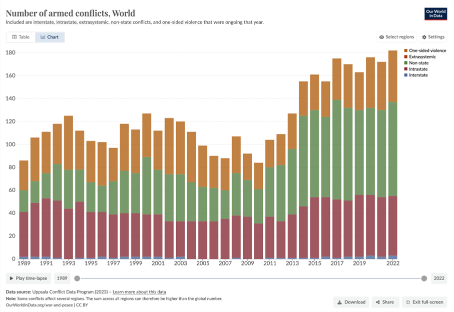 Source : https://ourworldindata.org/grapher/number-of-armed-conflicts