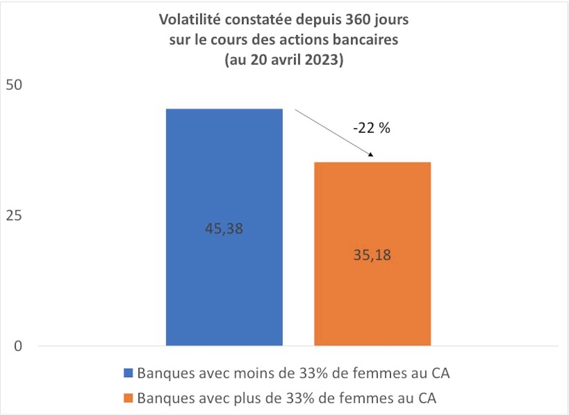 Les résultats sont similaires pour la volatilité (et donc le niveau de risque). La volatilité des banques ayant plus de 33 % de femmes dans leur conseil d’administration est de 35,18, soit 22 % inférieure à celles qui en ont moins de 33 % (45,38). Elles sont donc moins risquées.