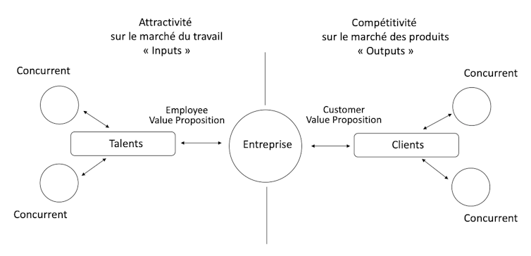 La proposition ici défendue est que l’attractivité de l’entreprise sur le marché du travail déterminée par son EVP conditionne la qualité de sa combinaison de ressources humaines au sein de l’organisation et, in fine, la qualité de sa proposition de valeur au client (customer value proposition) pour s’imposer sur son marché.