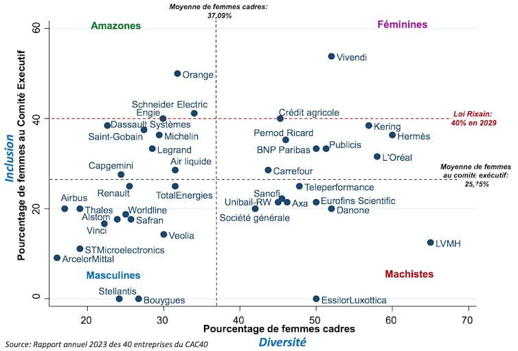 Paradoxalement, il y a plus d’entreprises ayant déjà atteint le quota de 40 % de femmes au comex fixé par la loi Rixain parmi celles qui ont un vivier limité de femmes managers intermédiaires (Orange, Schneider Electric et Engie) que parmi celles qui disposent d’un vivier plus conséquent (Vivendi et Crédit Agricole). Une politique volontariste de promotion des talents féminins semble donc possible, même dans les entreprises disposant d’un vivier réduit dans leur population d’encadrement.