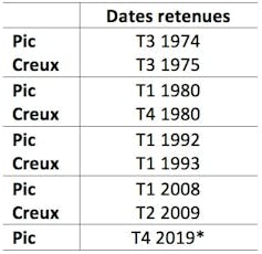 À l’issue de l’application de cette méthodologie, quatre épisodes ont été identifiés comme des périodes de récession en France depuis 1970 : les chocs pétroliers de 1974-75 et 1980, le cycle d’investissement de 1992-93, la grande récession de 2008-09 engendrée par la crise financière et le choc sanitaire lié à la pandémie de Covid-19. Les dates des points de retournement du cycle caractérisant ces récessions sont synthétisées dans le tableau 1 ci-contre.